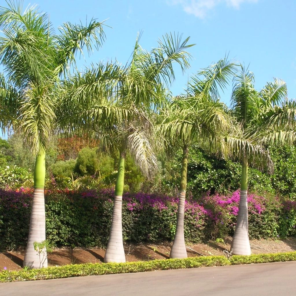 Le Roystonea regia appartient à la famille des arécacées. Il est originaire des Caraïbes et de Cuba, du Mexique et de Floride. Ce très beau palmier développe après plusieurs années un stipe unique et lisse, gris clair mais vert dans sa partie supérieure, presque brillant. Il présente un renflement caractéristique sous la zone de couleur verte. Le palmier royal peut atteindre dans la nature 30 m de hauteur, avec un stipe de 60 cm de diamètre, mais conservera des dimensions beaucoup plus modestes sous nos latitudes, et encore davantage en bac où il ne dépassera pas 5 m de hauteur pour 3 m d’envergure. A l’extrémité de ce stipe se développent une couronne presque ronde, composée de longues palmes pennées. Les plus jeunes sont dressées, tandis que les plus âgées sont légèrement retombantes. Chacune, pouvant mesurer jusqu’à 3.50 m de long (2 m en intérieur), est découpée en un grand nombre de folioles assez larges, de couleur vert vif, disposées sur quatre rangs. Les palmes mortes tombent d’elles-mêmes, sans laisser de cicatrice foliaire sur le stipe. La floraison, spectaculaire, a lieu en été, sur des sujets matures. Elle se développe sous la couronne foliaire, à la base de la zone supérieure du stipe colorée de vert. Ce sont de grandes inflorescences ramifiées et dressées, atteignant 1 m de longueur. Il existe des fleurs mâles et des fleurs femelles, portées par des inflorescences distinctes. Les fleurs, de couleur blanc crème à jaune pâle, sont nectarifères. Après pollinisation par les insectes, elles se transforment en fruits de 2 cm de long, d’abord rouges, devenant noirs à maturité.